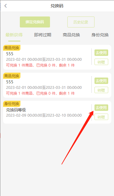 点击去使用,跳转到对应的兑换码页面。