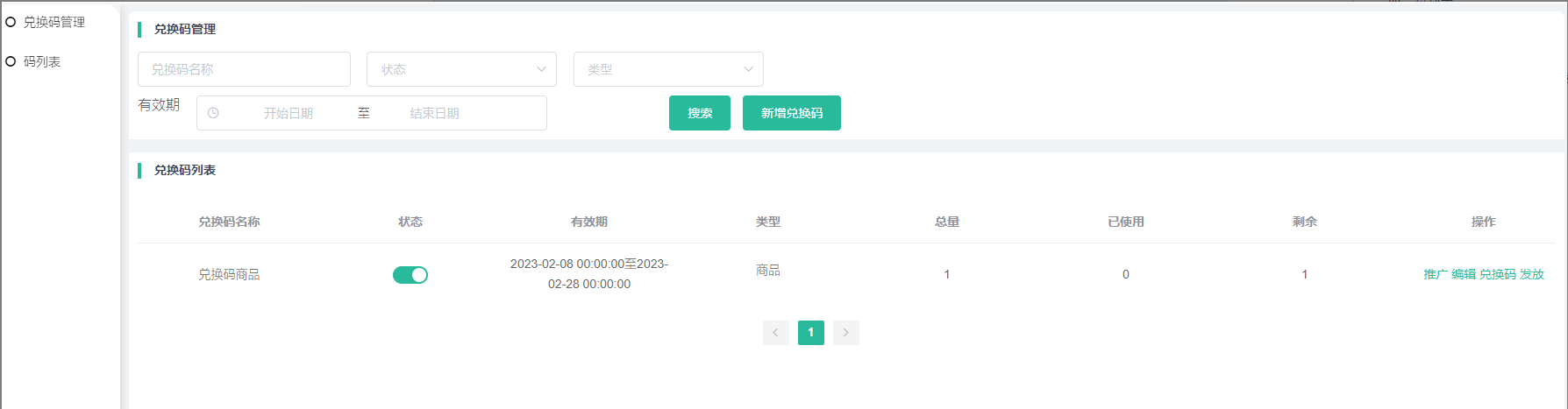 列表显示兑换码名称,状态,有效期,类型,总量,已使用,剩余数量,操作(如下)